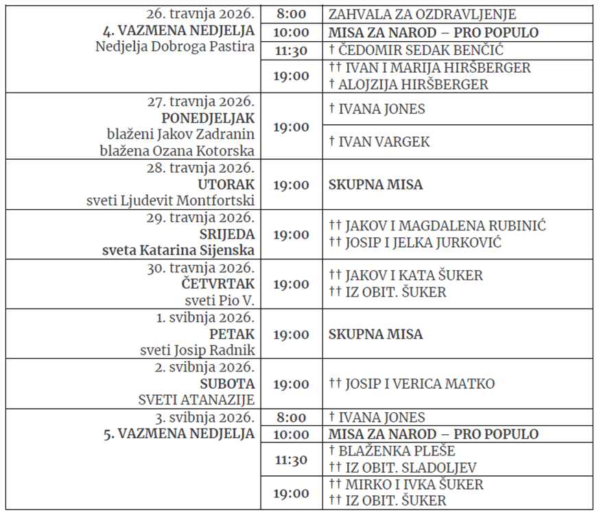 Sveta misa u ponedjeljak, utorak i srijedu u 19 sati, u četvrtak, petak i subotu u 8 sati.
